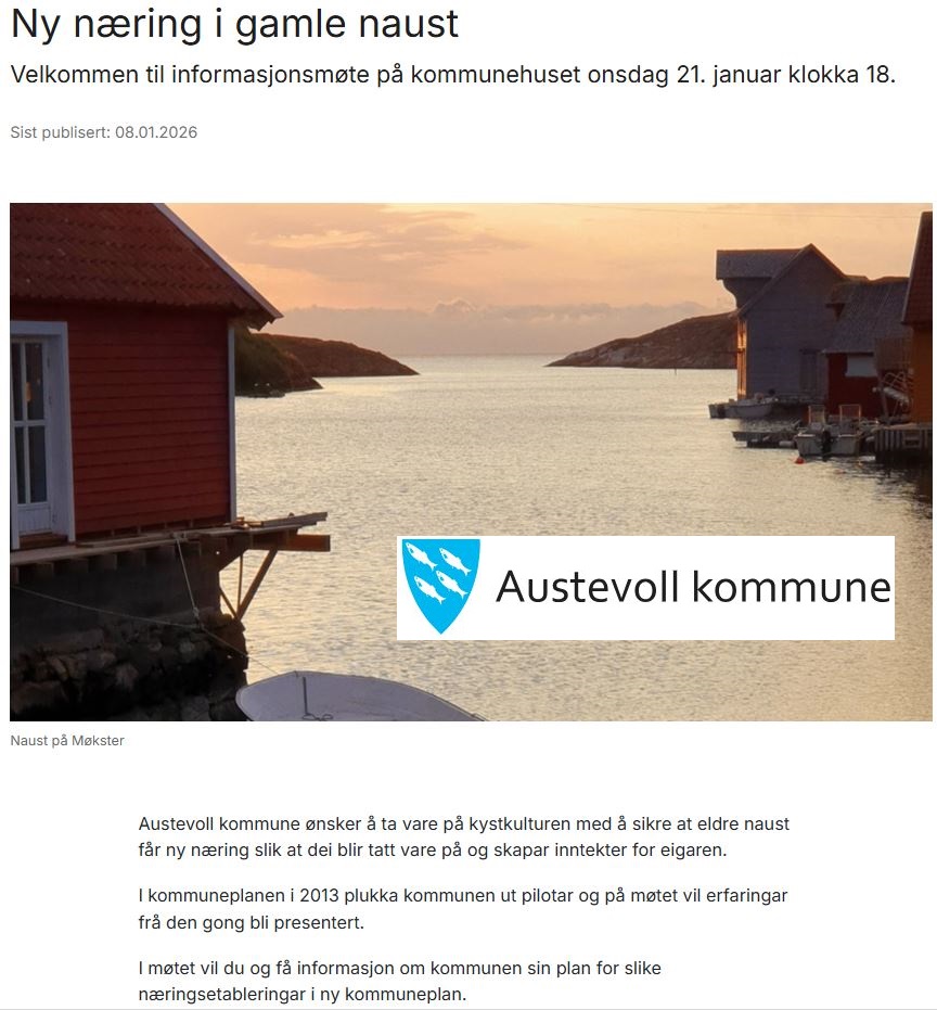 Den siste tida har ein registrert at fleire er opptatt av framtida til nautmiljøa . Tilstanden er framleis for nedadgåande sjølv om der har vore skrive og sagt mange fine ord om naust og kystkultur. Austevoll kommune ser no at nausta har ein verdi og dette vil bli drøfta på møte i 21. januar.
